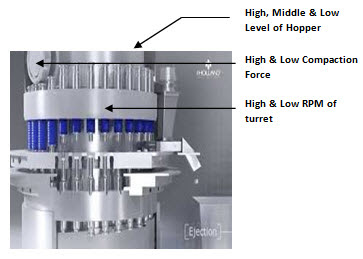 • Samples shall be withdrawn for various challenge tests such as but not limited to variation in compaction force of the machine, variation in speed of the machine, from high, middle and low level of powder in the hopper of the compression machine.