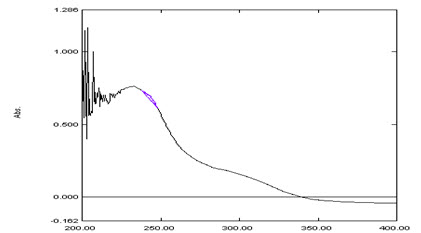 In this method, 10 μg/ml solution of rosuvastatin calcium was prepared by appropriate dilution of standard stock solution and scanned in the spectrum mode from 400-200 nm. The absorption spectra obtained was derivatized to first order derivative spectra. The first order derivative spectra show maxima and minima at 238 nm and 205 nm respectively (Figure 4). The absorption difference is calculated which was directly proportional to the concentration of the standard solution. The calibration curve for rosuvastatin calcium was plotted in the concentration range of 5-35 μg/ml and scanned in the Second order derivative spectra. The calibration curve of d2A/dλ2 against concentration of drug showed linearity.