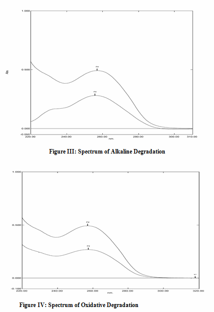 f. Stability Results: The results obtained in alkaline degradation, oxidative degradation, photolytic degradation, hydrolytic degradation and acidic degradation are depicted as spectrums and given in figure III, IV, V and VI. respectively and data is represented in table no. 3