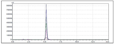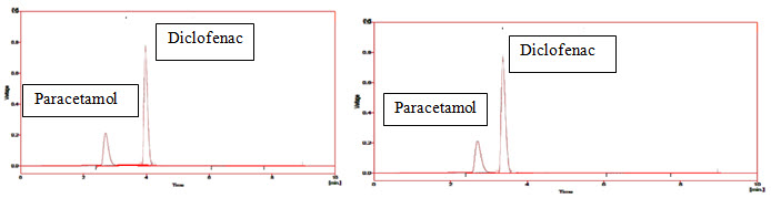 Rt of paracetamol varies between 2.5-3.5min; Rt of ibuprofen varies between 6.15-6.8min and Rt of diclofenac varies between 3.4-3.8min. The focus of in-vivo metabolic profile of Prodrugs has been implemented into in-vitro hydrolytic reaction in both acidic and alkaline pH to get the satisfactory desired result