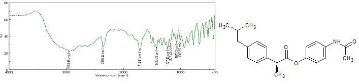 CH3 asym. stretch: (standard=2970-2950/2880-2860, found=2953.45), >C=O stretching: (standard=1725-1705, found=1714.41), Amide II band: (standard=1680-1630, found=1509.03), CH-CO deformation: (standard=1470-1430/1380-1370, found=1420.32), C=C stretching: (standard=1615–1580, found=1610), C-N-H group: (standard=1090–1020, found=1070.3), Para-disubstituted aromatic ring: (standard=860–800, found=850).[13]