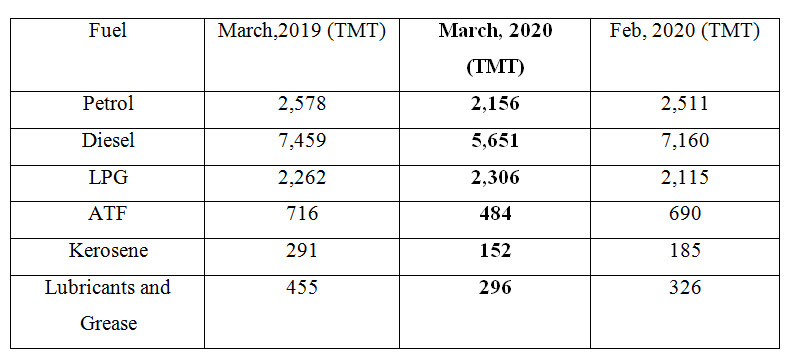 The present scenario has basically affected the consumption of crude oil all over the world. It is very shocking to see that the demand of petroleum has shown a substantial decrease in the last ten years, as reported by the ET Energy World up to 2009-10. It was seen that in the month of March 2020 itself, a decline of about 18% with a rate of 16,083 Thousand Tonne (TMT) was reported by the ministry when was compared to the same month a year ago. When seen for diesel, the decline was about 24.23% to a level of 5,651 TMT in March, 2020 as compared to the same a year ago. When elucidating on the financial year 2019-20, the consumption of diesel decreased up to 1.13% which was the maximum decline past decade. This has badly hit the Indian economy as diesel being the primary source of liquid fuel used in various vehicles, passenger vehicles, apart commercial use is also seen. Evidently, the petrol and diesel price narrowed and also improved the conditions of roads but this pandemic showed a decrease of about 16.36% which made up to 2,156 TMT in march as and when compared to the corresponding a year ago. Astonishing facts were from the Aviation Turbine Fuel (ATF) which decreased to 484 TMT with a percentage of 32% in March 2020, when compared to the same a year ago. It was only the LPG that showed a spike increase for about 2% reaching up to 2,306 TMT in March.