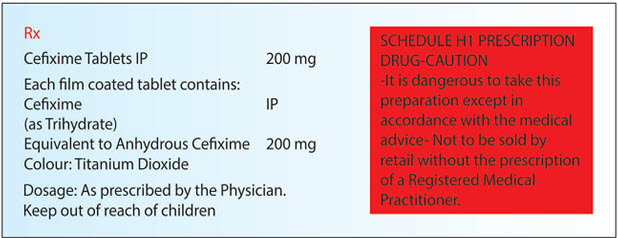 (e) if it contains a drug substance specified in Schedule H1, be labeled with symbol Rx, which shall be in red and conspicuously displayed on the left top corner of the label and shall also be labeled with the following words in legible black coloured font size in completely red rectangular box: (Ministry of Health and Family Welfare G.S.R. 408 (E).)