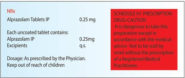 (f) if it contains a drug substance specified in Schedule H1 and comes within the purview of the Narcotic Drugs and Psychotropic Substances Act, 1985 (61 of 1985) be labeled with symbol NRx, which shall be in red and conspicuously displayed on the left top corner of the label and shall also be labeled with the following words in legible black coloured font size in completely red rectangular box: (Ministry of Health and Family Welfare G.S.R. 408 (E).)