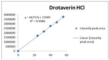 Correlation coefficient of the linearity study was found to R2 =0.998 and 0.999 with linear regression equation Y=46573X+5706 for Drotaverin and Y=161434X-32034 for Aceclofenac, which proves the method was linear.