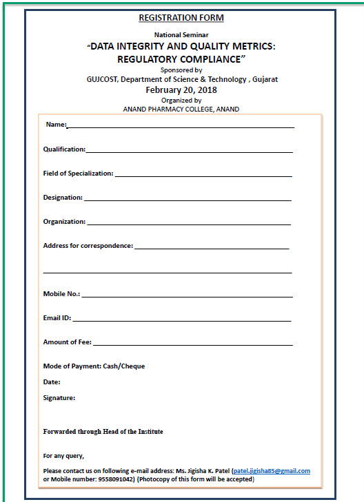 Applicants are required to send/deposit their duly signed registration form along with registration fees through cash/cheque (in favor of Principal, Anand Pharmacy College, payable at Anand).