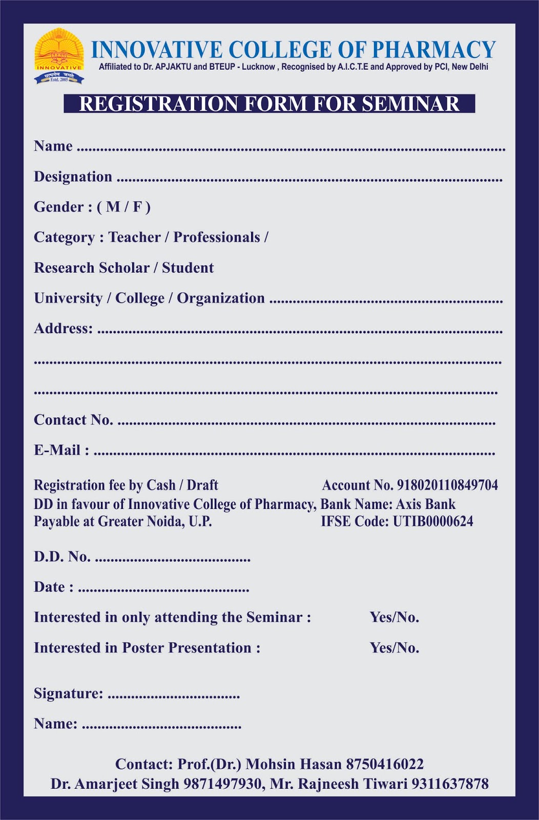 Scientific papers are invited for poster and oral presentation. Original and unpublished work shall reach convenor by 12th March 2019. The abstract should be submitted online in MS word, Times New Roman, 12 font, 1.5cm spacing with maximum 250 words to pharmacy01@gmail.com Only registered candidates will be allowed to present the accepted papers and he/she must be one of the co- authors of the paper during submission. The abstract should include title in capital, authors with surname followed by initials and affiliations.