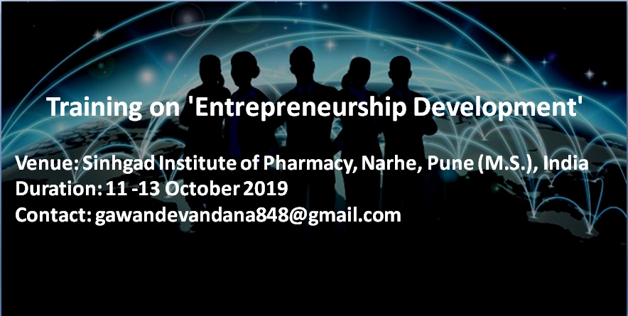 If you can find something you love to do, you can turn it in a business. On behalf of the organizing Committee, all of us have the pleasure to cordially invite you to Learn 'Entrepreneurship' skills in 3 days comprehensive training on 'Entrepreneurship Development' by certified trainer from IIT at Sinhgad Institute of Pharmacy, Narhe.