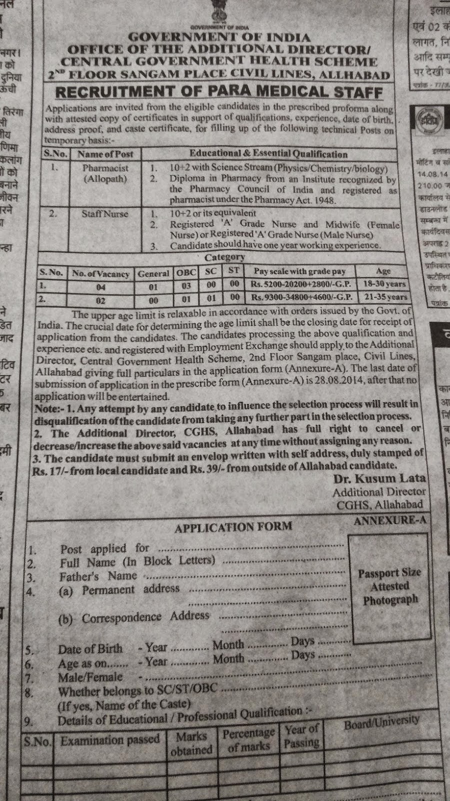The upper age limit is relaxable in accordance with orders issued by the Govt. of\ India. The crucial date for determining the age limit shall be the closing date for receipt of application from the candidates. The candidates processing the above qualification and experience etc. and registered with Employment Exchange should apply, to the Additional Director, Central Government Health Scheme, 2nd Floor Sangam place. Civil Lines, Allahabad giving full particulars in the application form (Annexure-A). The last date of submission of application in the prescribe form (Annexure-A) is 28.08.2014, after that no application will be entertained.