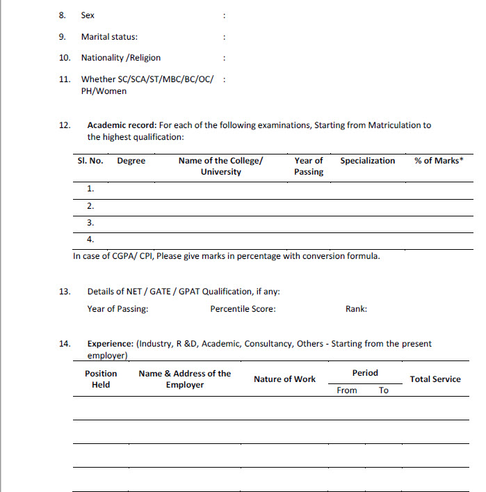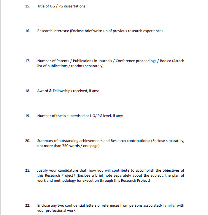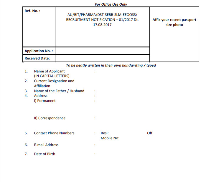 2. Enclose attested photocopies of relevant certificates/ proofs wherever necessary. Applications not in proper format / without documentary evidences are likely to be rejected 3. Duly filled Application along with enclosures should be submitted in 28 x 12 cm envelop mentioning the Application for the Post of JRF in the DST-SERB sponsored research project entitled “Bioactivity … supplements” on the top of envelop.