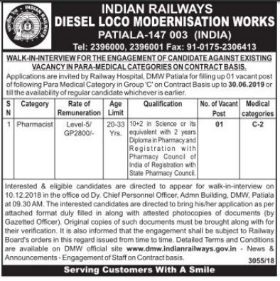Applications are invited by Railway Hospital DMW Patiala for filling up 01 vacant post of pharmacist in group 'C' Contract Basis upto 30.06.2019 or til the avaliability of regular candidate whichever is earlier.