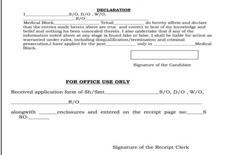16. Interested candidates from District Jammu only should apply by sending their application on the prescribed format enclosed. The duly filled in application form along with self attested testimonials two recent passport size photograph self attested) should reach in the office of the Convener/ Vice Chairman District Health Society (Chief Medical Officer) Jammu with in One month from the date of advertisement. Date of written test will be notified separately.