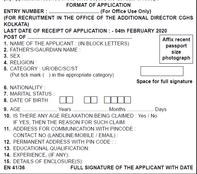 (i) The application in the prescribed format given herewith duly supported with selfattested photocopies of all certificates and mark-sheets should be sent by Speed Post/Registered Post to the following address: Additional Director, Central Government Health Scheme, 6-Esplanade East, (Ground Floor), Kolkata - 700069 to reach this Office on or before 04th February, 2020. The Envelope should be superscribed as "Application for the post of Pharmacist (Entry Grade) (Allopathy) in CGHS, Kolkata or Application for the post of Nursing Officer in CGHS, Kolkata" as the case may be.