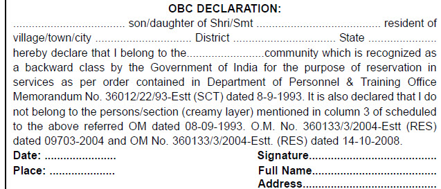 (ii) The Certificate that he/she does not belong to the persons/sections (Creamy Layer) should have reference to Government of India DOPT OM No. 36033/3/ 2004-Estt (Res) dated 14-10-2008.