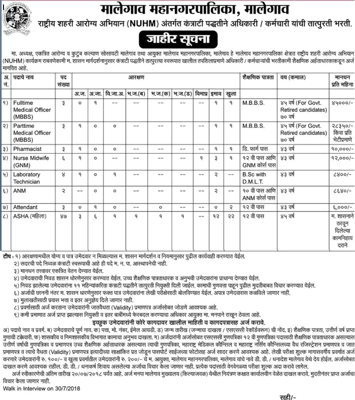 Candidates can submit their application form in a prescribed format to Malegaon MMC NUHM along with all required documents copies on or before 20-7-2018.
