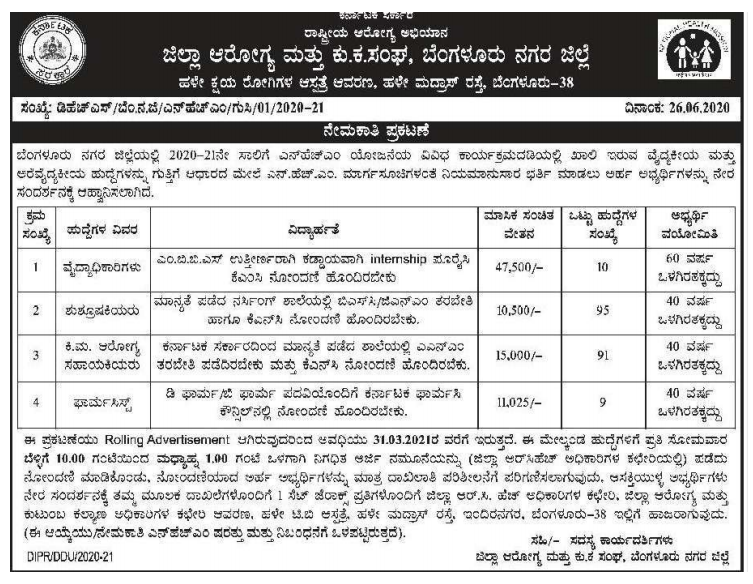 Venue: Office of Bangalore R.C.H Officers’, Office of District Health and Family Welfare Officers’ Premises, Old T.B Hospital, Old Madras Road, Indiranagar, Bangalore – 38
