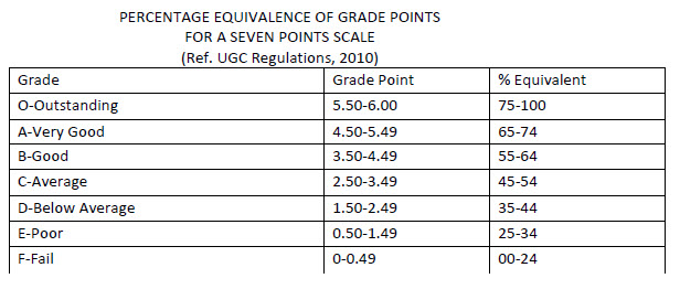 26. The grade point B in the 7 point scale (Grades O, A, B, C, D, E & F) shall be regarded as equivalent to 55% wherever the grading system is followed.
