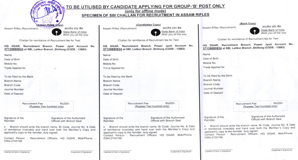 (b) Candidates who are applying through Offline system the application fee will be deposited through challan (format att) into Power Jyoti Account No 37139880824 in favour of HQ DGAR. Recruitment Branch. Shillong-10