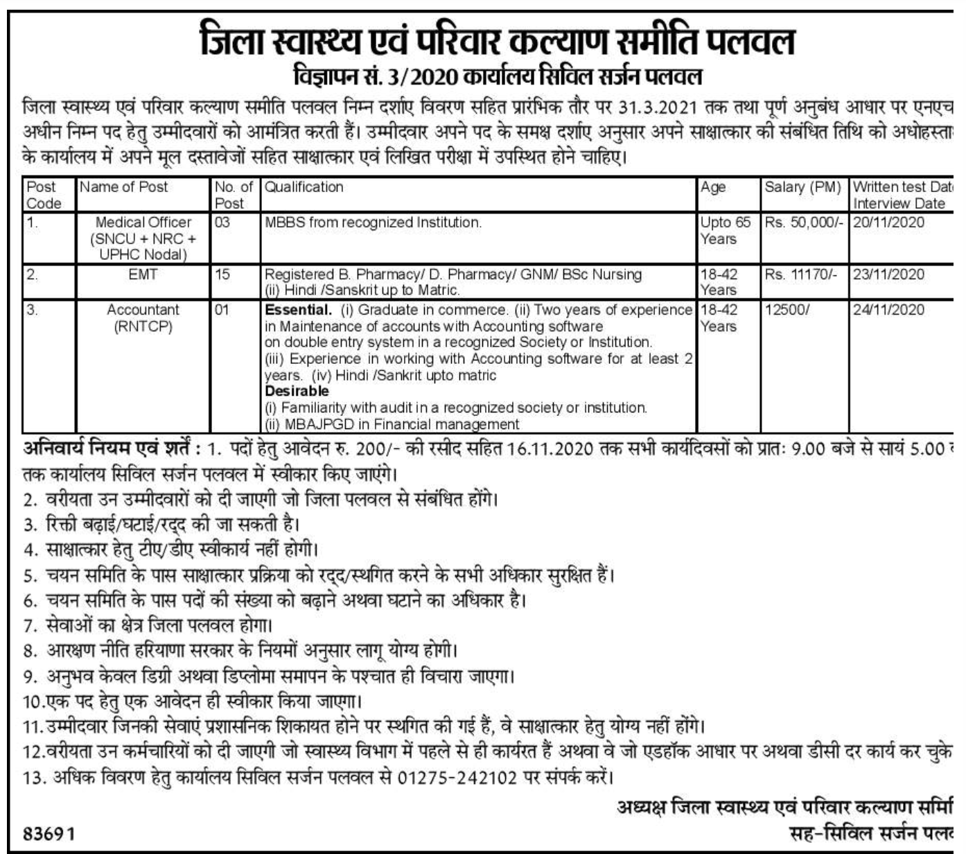 1. Application for posts with receipt of Rs. 200 / - till 16.11.2020 on all working days from 9.00 AM to 5:00 Pm evening Till the office will be accepted in Civil Surgeon Palwal.
