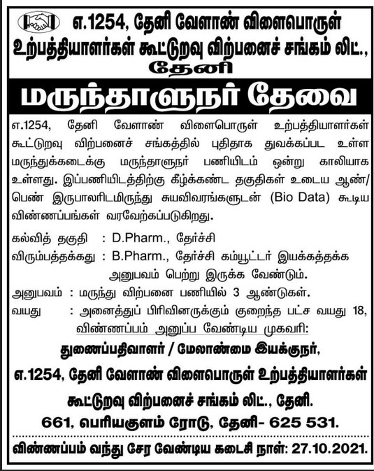 Application should be sent to : Deputy Registrar / Managing Director, A.1254, Theni Agricultural Producers Cooperative Marketing Association Ltd. , Theni, 661, Periyakulam Road, Theni-625531
