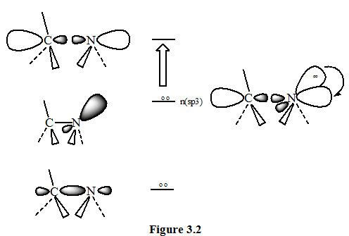 (2).ALCOHOLS, ETHERS, AMINES AND SULFUR COMPOUNDS: In saturated molecules that contains atoms bearing nonbonding pairs of electrons, transitions n-σ* of the type become important .They are also rather than high-energy transitions, but they do absorb radiation that lies within an experimentally accessible range. Alcohols and amines absorb in the range from 175 to 200 nm. While organic thiols and sulfides absorb between 200 and 220 nm. Most of the absorption is below the cutoff points for the common solvents, so they are not observed in solution spectra. Figure 1.2 illustrate an n-σ* transition for an amine. The excitation of the non-bonding electrons to the anti-bonding orbital is shown at the right.
