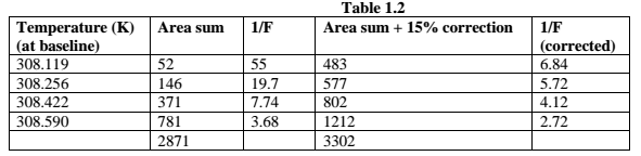 The bottom plot should now show the corrected area as a function of temperature. Integrate the full melting peak as you did for indium in the middle P vs. temperature plot. Determine the temperature where melting begins. Determine the temperature where the power, P, is about 2/3 of the maximum P value. Highlight the data between these two temperatures in the Logger Pro spreadsheet for Iadj and Tb, and copy and paste this data into Excel. Note that Iadj is the Area Sum in Table I before the pre-melting correction and Tb is the temperature extrapolated to the baseline, which is also the temperature needed for the calculations in Table I.