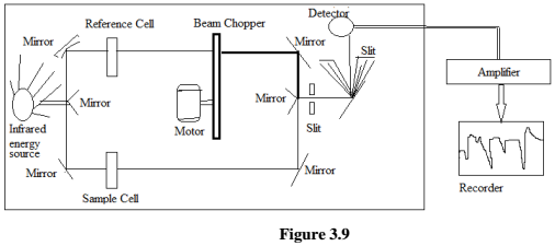 The dispersive IR instrument shown in figure 1.7produces a beam of infrared radiation from a hot wire and, by means of mirrors, divides it into two parallel beams of equal intensity radiation. The sample is placed in one beam, and the other beam is used as a reference. The beams then pass into the monochromator, which disperse each into a continuous spectrum of frequencies or infrared light. The monochromator consists of a rapidly rotating sector (beam chopper) that passes the two beams alternatively to a diffraction grating (a prism in older instruments). The slowly rotating diffraction grating varies the frequency or wavelength of radiation reaching the thermocouple detector. The detector senses the ratio between the intensities of the reference and sample beam. In this way, the detector determine which frequency have been absorbed by the sample and which frequency are unaffected by the light passing through the sample. After signal from the detector is amplified, the recorder draws the resulting spectrum of the sample on a chart. Disperse instruments are said to record a spectrum in the frequency domain.
