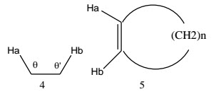 Angle strain -In the fragment 4, 3J decreases as θ and θ’ increase, This effect is noticeable in the cis coupling constants between the olefinic protons in cyclic alkenes (5); as the ring size changes, the coupling constant changes. It is therefore possible to tell in many cases into what size ring a double bond is incorporated.
