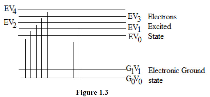 Ultra violet absorption spectra arise from transition of electron or electrons with in a molecule or an ion from a lower to a higher electronic energy level. Both organic and inorganic species exhibit electronic translations in which outermost of bonding electrons are promotes to higher energy levels. A compound appears colored if it absorbs light in the visible region and reflects the light of wavelength in the rest of the visible region. The main function of absorbed energy is to raise the molecule from the ground state energy E0 to the higher excited state (energy E1) shown in fig. 1.3.