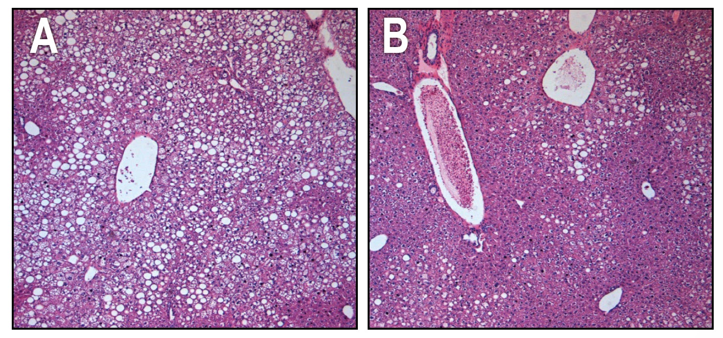 In the liver tissue of obese animals with type 2 diabetes, unhealthy, fat-filled cells are prolific (small white cells, panel A). After chronic treatment through FGF1 injections, the liver cells successfully lose fat and absorb sugar from the bloodstream (small purple cells, panel B) and more closely resemble cells of normal, non-diabetic animals.