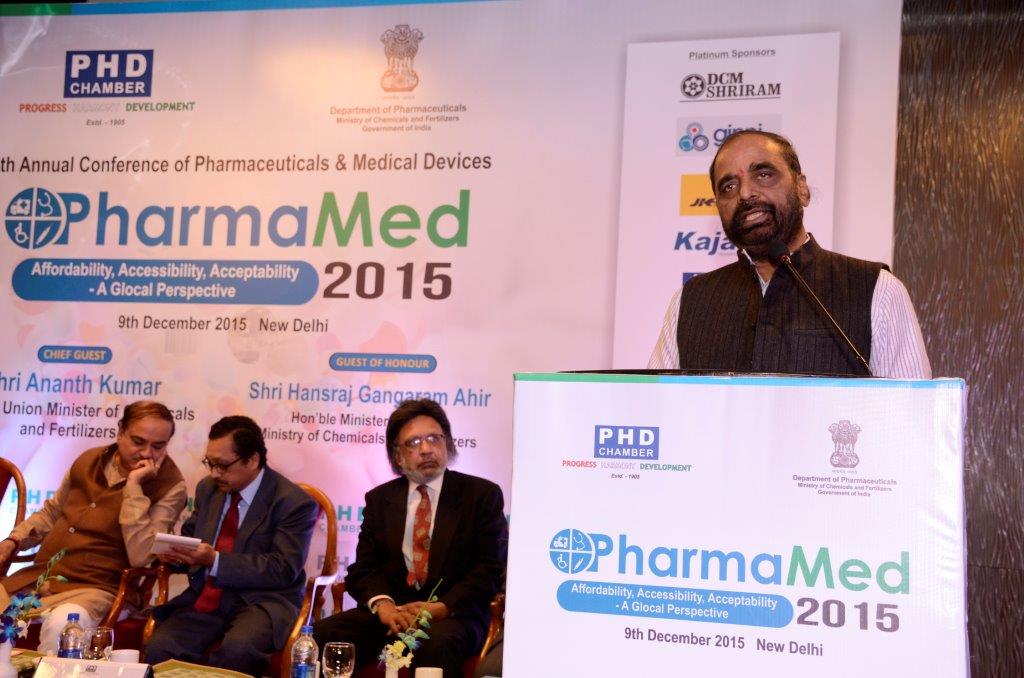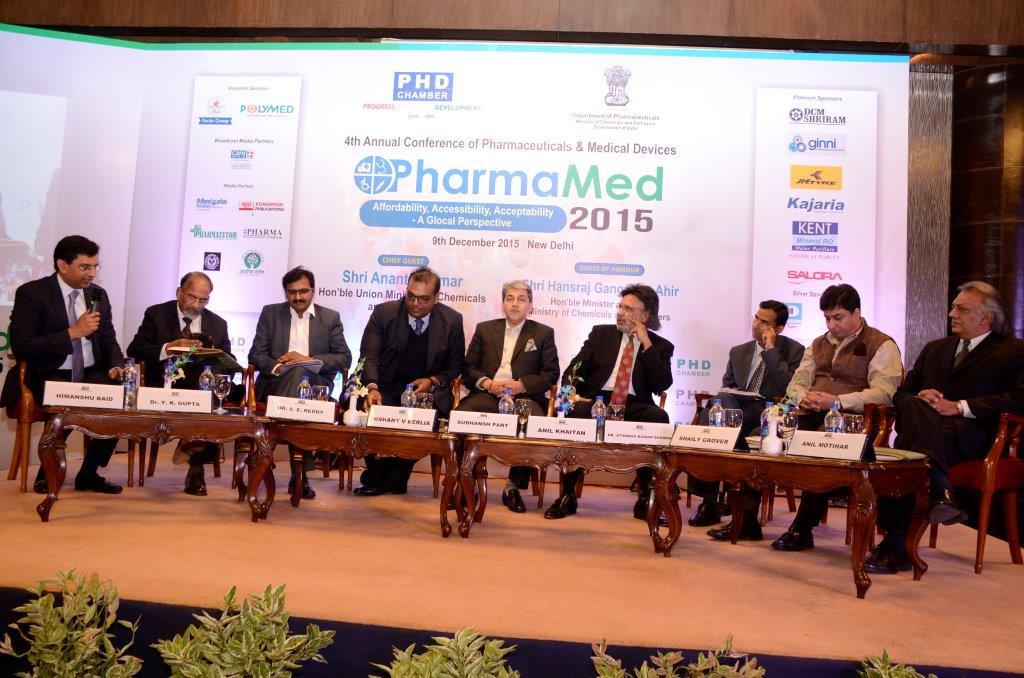 While inaugurating the 4th Annual Conference : PharmaMed 2015, organized by the PHD Chamber of Commerce and Industry, Hon,ble Minister said , “the government will continue to control the regulated list of pharma products that currently number 603 though it might revise it to enable access, affordability and acceptability (with quality) of the pharma products to patients in far flung areas. He added that the Govt. will not loosen its control on essential and life savings pharma products in the interest of the common man”.