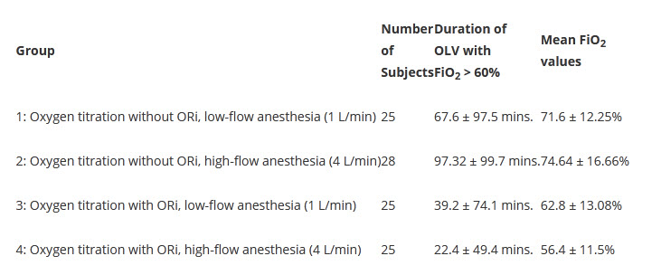 The researchers found that ORi monitoring was associated with significantly shorter duration of OLV with FiO2 > 60%, with significantly lower mean FiO2 values during OLV (as shown in the table above), and with lower recorded PaO2 values. They also found that the duration of FiO2 > 80% during OLV was strongly correlated with longer hospital stays (p < 0.001).
